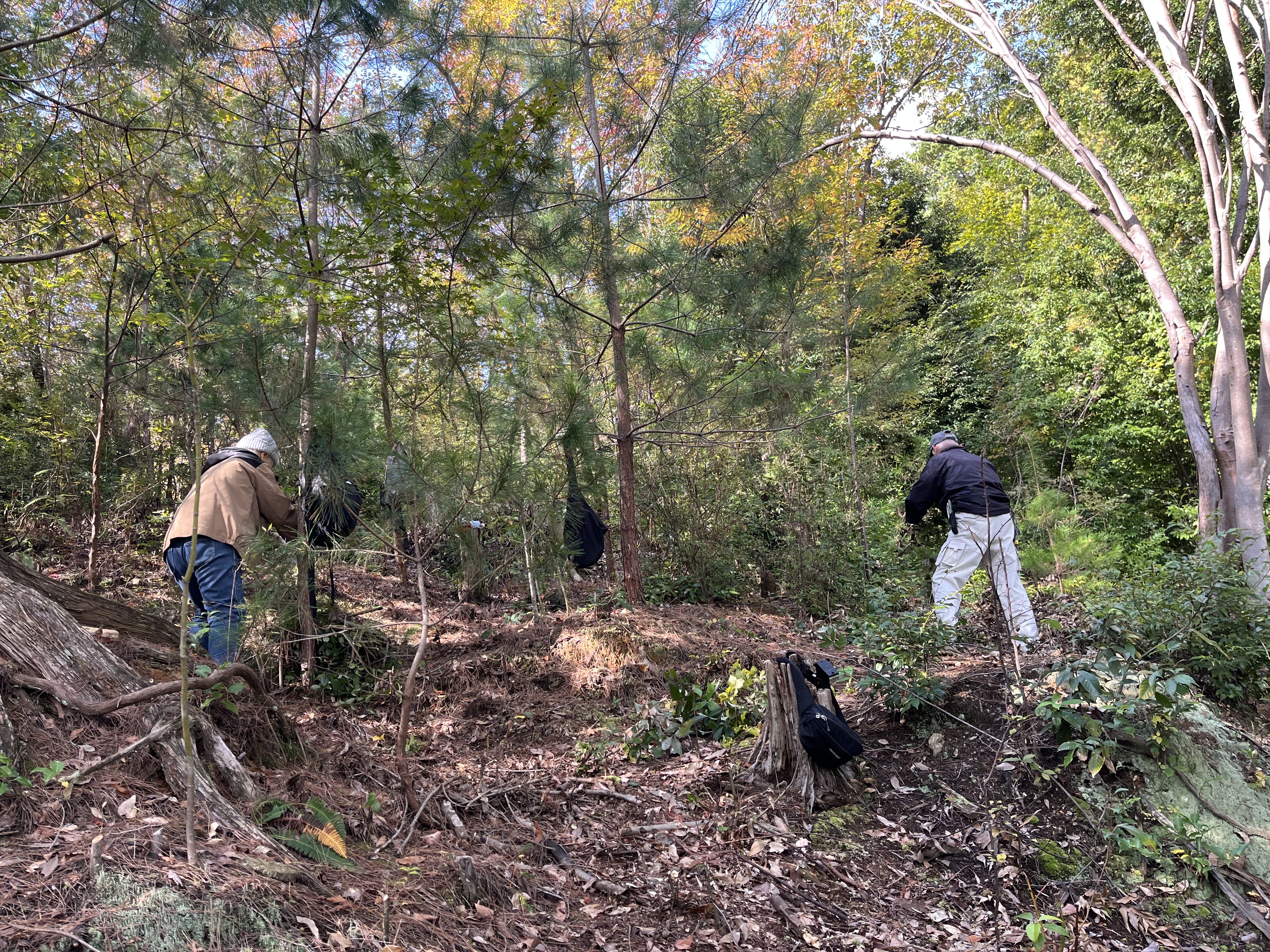 11月7日(金)は景勝・小倉山を守る会の定期活動日でした。守る会の会員さん約6名にご参加いただき、先月に引き続きコジイの除伐、日当たりと風通しをよくするための樹木の伐採、下草刈りを行いました。